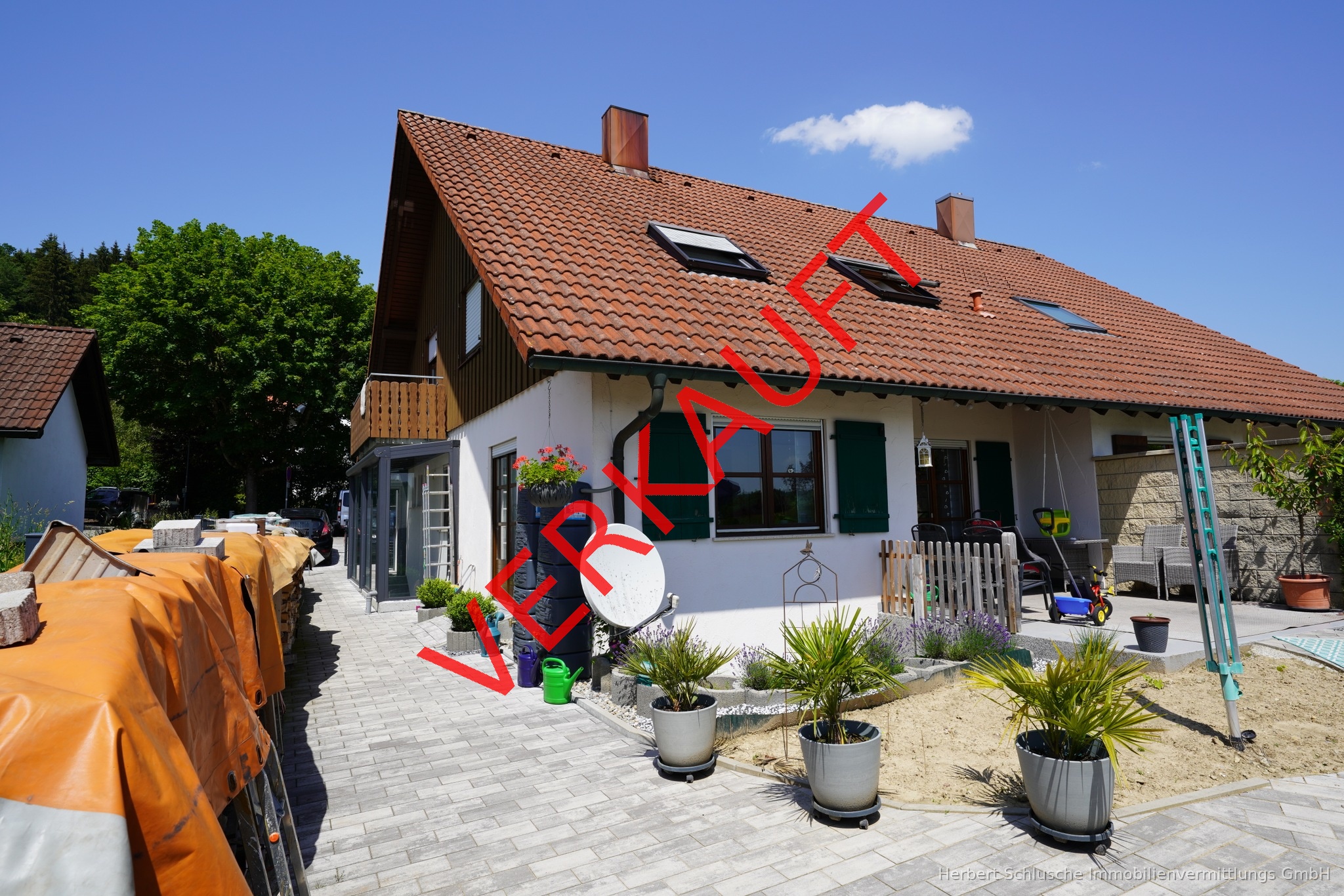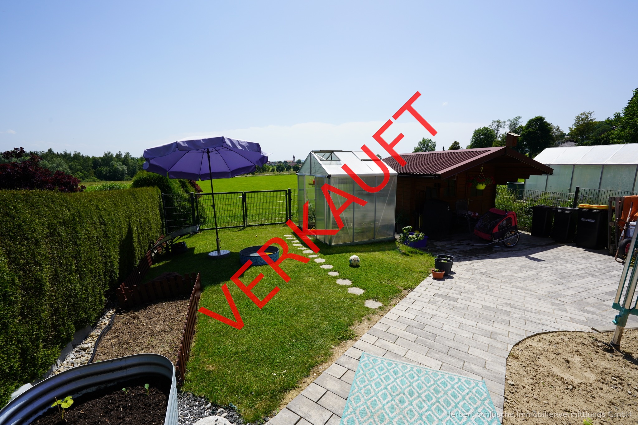 Die interessante neue Gartengestaltung mit Sonnenterrasse, Gewächshaus und einem Gartenhaus und ein schöner Westbalkon laden Sie zum Entspannen und Verweilen ein.