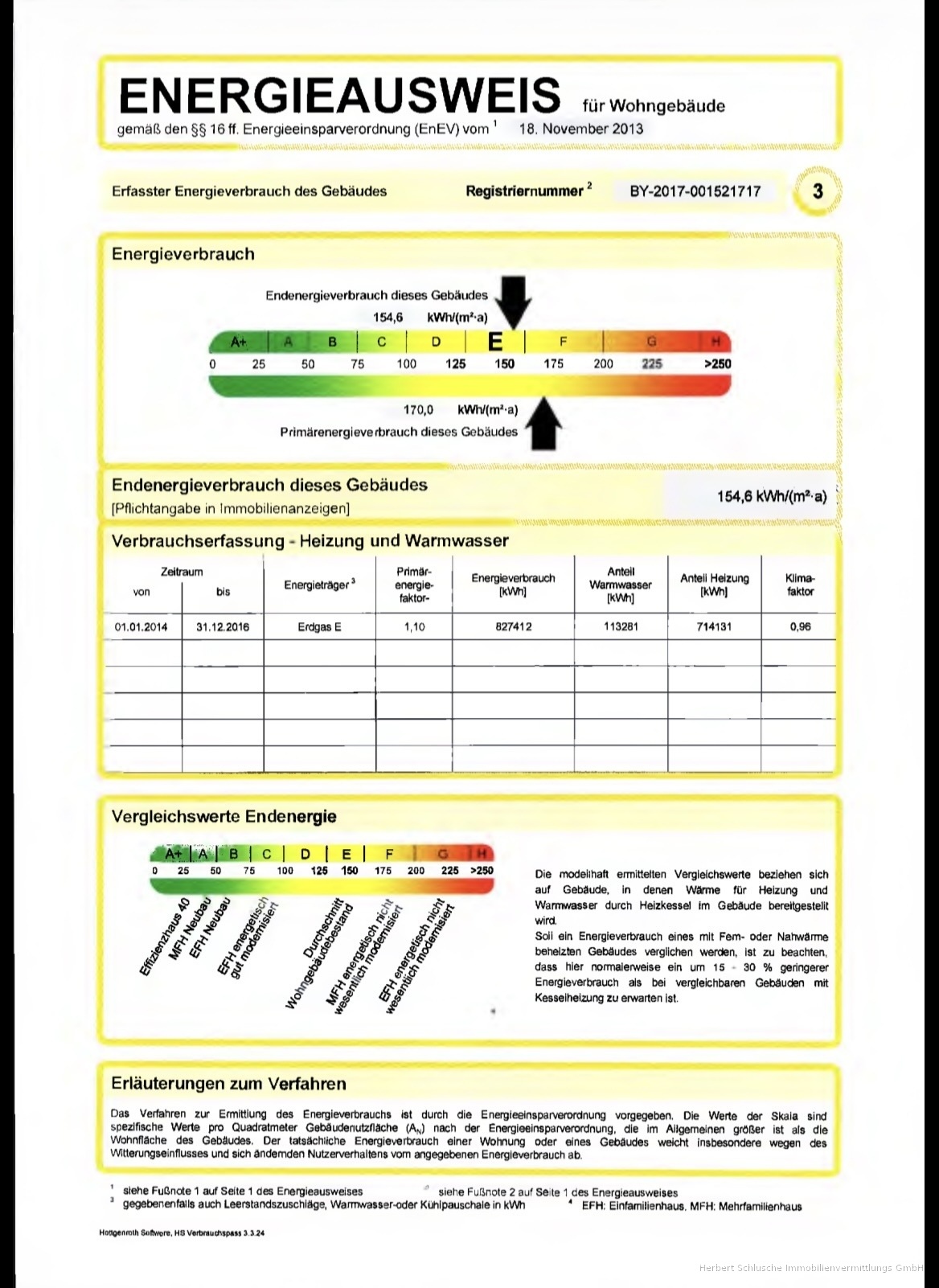 Angaben lt. ENEV 2014: Verbrauchsausweis, Kennwert: kWh/(m²*a), wesentlicher Energieträger ist Gas