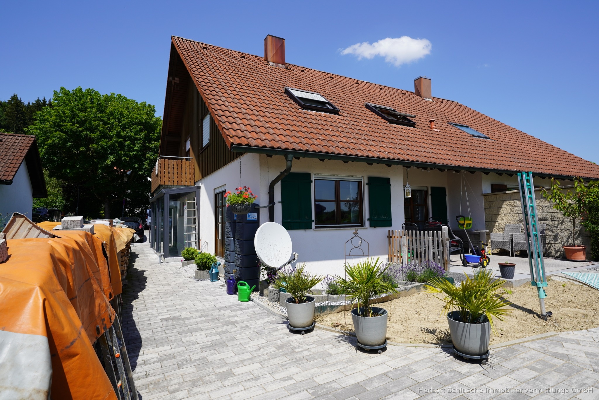 Die interessante neue Gartengestaltung mit Sonnenterrasse, Gewächshaus und einem Gartenhaus und ein schöner Westbalkon laden Sie zum Entspannen und Verweilen ein.